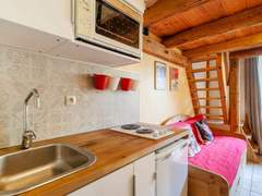 1-Zimmer-Studio 25 m2 auf 2 Stockwerken im 3. Stock, Ostlage. Wohn-/Esszimmer mit 1 Ausziehbett (2 x 80 cm, Länge 190 cm), TV (Flachbildschirm). Ausgang zum Balkon. Abgeschrägte Galerie mit 1 franz. Bett (140 cm, Länge 190 cm). Kleine, offene Küche (2 Kochplatten, Mini-Backofen, Backofen, Geschirrspüler, Toaster, Wasserkocher, Mikrowelle, elektrische Kaffeemaschine). Dusche/WC. Balkon, Ostlage. Bitte beachten: Nichtraucher-Unterkunft. 1 kleines Haustier/Hund erlaubt. Rauchmelder, Feuerlöscher. Anstelle eines abgeschlossenen Schlafzimmers befinden sich manche Schlafplätze in einem offenen Bereich (Galerie, Nische etc.). Inserat einer Privatperson nach Artikel 155, IV, CGI.