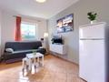 "Gordana", 3-Zimmer-Wohnung 50 m2 im 1. Stock. Wohn-/Esszimmer mit 1 Diwanbett, Sat-TV und Klimaanlage. Ausgang zum Balkon. 1 Zimmer mit 2 Betten. 1 Zimmer mit 1 franz. Bett. Kochnische (Backofen, 4 Glaskeramikplatten, Toaster, Wasserkocher, Tiefkühler, elektrische Kaffeemaschine). Dusche/WC. Keine Heizmöglichkeit. Balkon 5 m2. Balkonmöbel. Sicht auf das Schwimmbad. Zur Verfügung: Internet (Wireless LAN, gratis). Bitte beachten: Nichtraucher-Haus. Beim Mietobjekt handelt es sich um ein Typenhaus bzw. Um eine Typenwohnung.